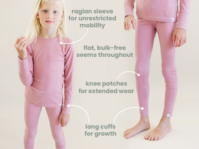 Designed with long cuffs to accommodate growth, your child will enjoy multiple seasons of wear from a single size. Soft, flat seams are for extra comfort and less bulk, and knee patches for extended wear. When paired with the merino kids long-sleeve tops, whether worn alone or as base layers under other clothes, they are perfect for hiking, skiing, or exploring.
